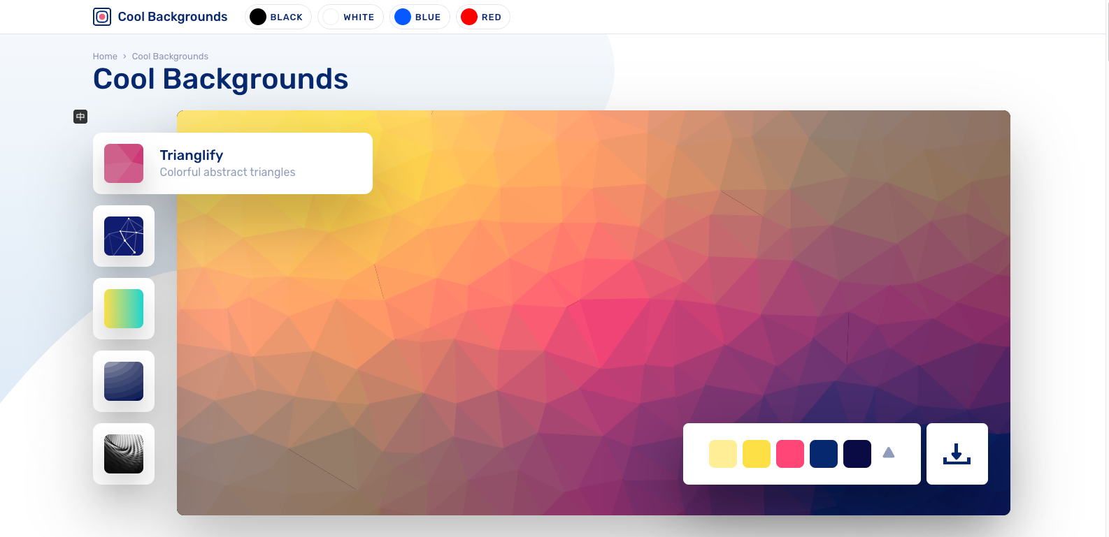 Cool Background 是由5个开源生成器整理组成的彩色渐变图像集合在一起的工具集,内置5种不同的背景风格,每一种风格还提供了简单的参数配置。非常的炫酷美观